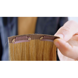 Invisible clip ins using "B-Cover" technology ensure a seamless blend. Our rooted hair extensions start with 3 cm of dark roots, smoothly transitioning to lighter shades on lengths and tips for a natural, chemical-free, striking appearance.
